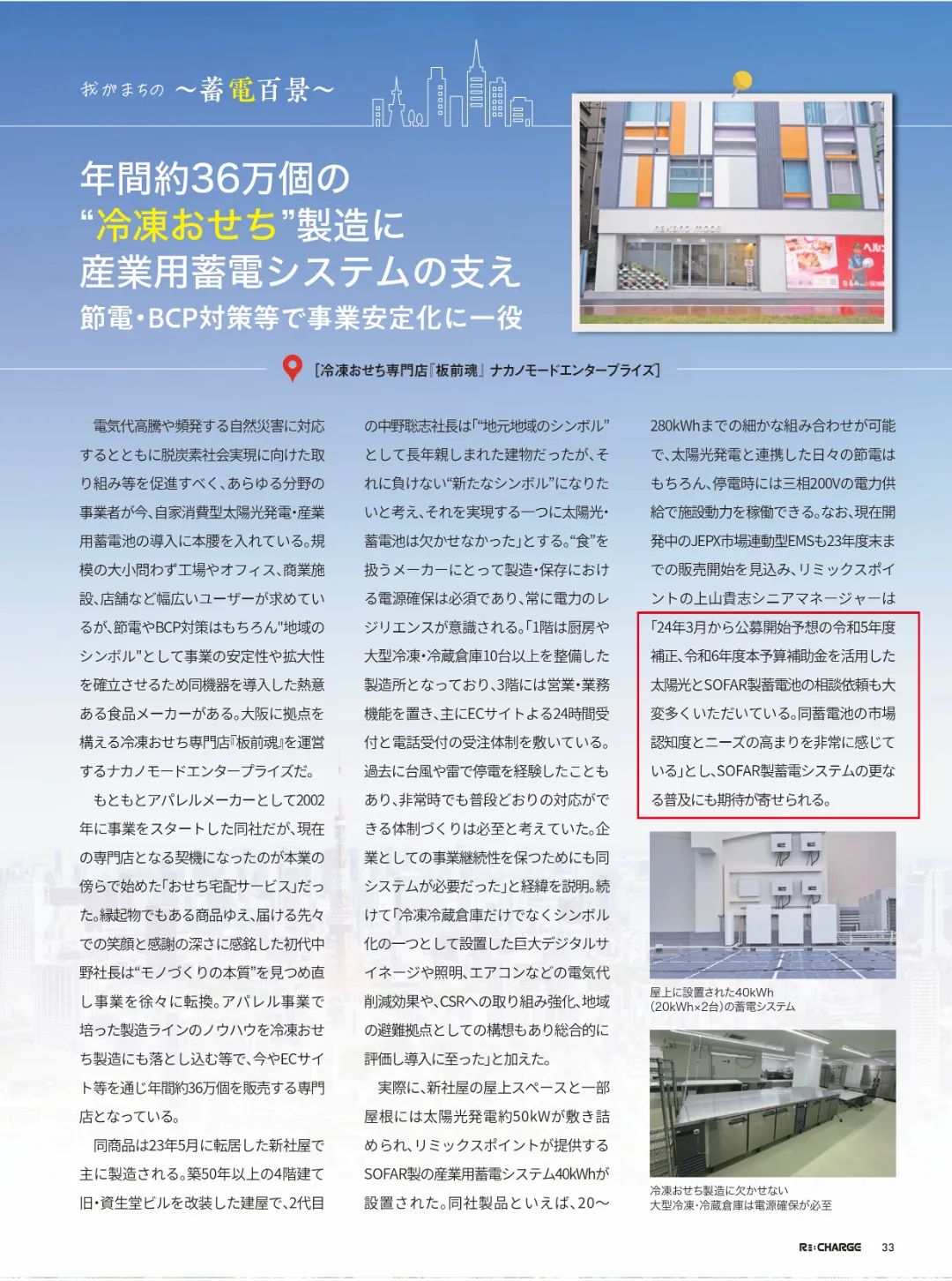关于从事"食物"的制造商来说,生产和生涯时的电源包管是必不可少的,必需时刻关注电力的韧性。"一楼是厨房和10多台大型冷冻冷藏库组成的生产区,三楼是营业和营业功效,主要通过电商网站实现24小时接单和电话接单。已往曾因台风和雷击导致停电,因此建设在紧迫情形下也能如常应对的体制是当务之急。为了维持企业的事业一连性,这套系统也是须要的。" Nakano Mode公司前社长中野先生说道。